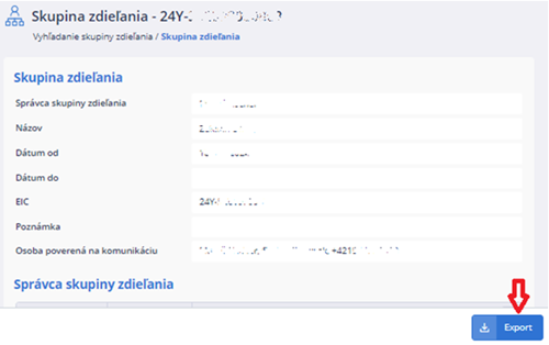 8. Po založení skupiny zdieľania si môžete prezerať jej výsledky a exportovať, koľko ste vyzdieľali. Na faktúre od vášho dodávateľa by táto suma mala byť odpočítaná od ceny za odobratú elektrinu vo vašich odberných miestach.